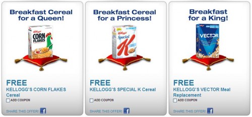 Choose one of the coupons shown to get either Kellogg's Corn Flakes, Special K or Vector - and then select up to three more Kellogg's coupons to be mailed directly to your home.